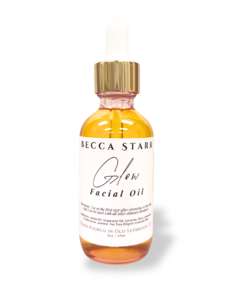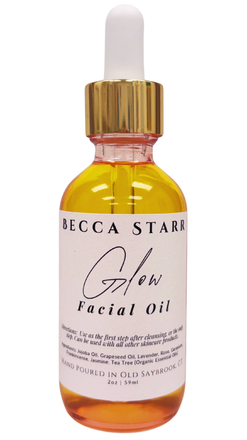 Glow is a nourishing, lightweight facial oil infused with jojoba, rose, chamomile, lavender, geranium, tea tree, and frankincense.